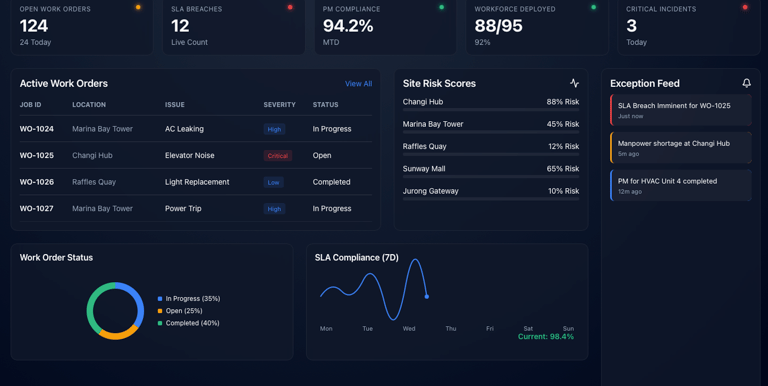 While each module operates independently, they can all connect into a unified operations dashboard designed for management and leadership teams. This command centre provides real-time visibility into job backlogs, SLA performance, preventive maintenance health, technician utilisation, and operational costs. Managers can drill down from high-level indicators into individual sites, assets, or work orders, turning operational data into actionable insight.